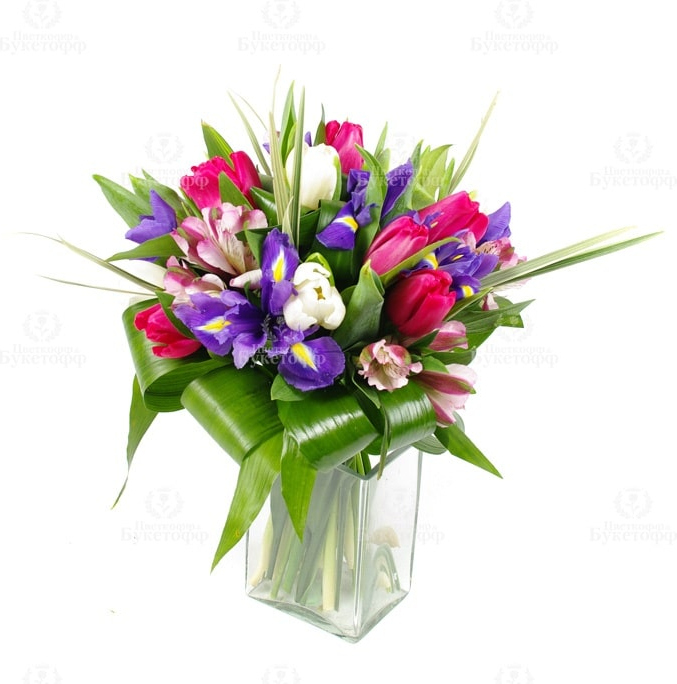 Этот замечательный букет из чудесных тюльпанов, ирисов и альстромерий, наполненный очарованием, юностью и легкостью прекрасно подойдет для свидания, или для послания-комплимента понравившейся вам девушки, и подарит ей массу положительных эмоций.